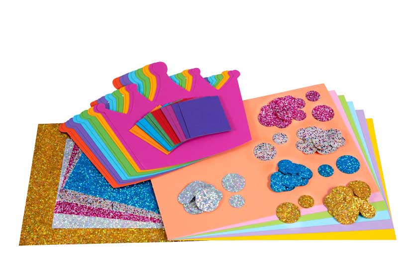 Inhalt: je 12 Kronen und Fotorahmen aus Fotokarton sortiert und dazu passend Kronenspitzen groß & klein sortiert (bereits ausgeschnitten), Fotokarton sortiert, Glitterkarton sortiert)