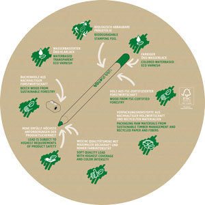 Die Stifte stammen aus ökologischer Herstellung und sind komplett biologisch abbaubar, aus nachhaltigem Buchenholz gefertigt und mit Öko-Wasserlack lackiert.