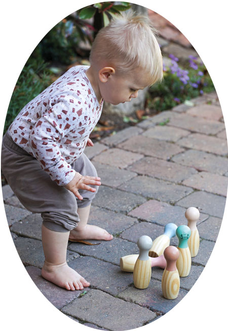 Klassisches Kegelspiel aus robustem Massivholz für drinnen und draußen geeignet. Die handliche Größe der Kegel und Kugeln ist perfekt für kleine Kinderhände.