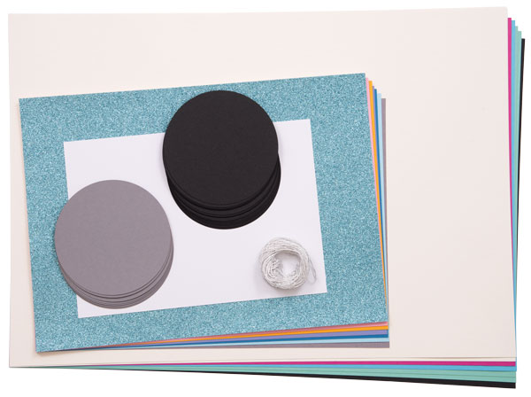 Inhalt: 30 Fotokartonkreise sortiert (bereits ausgeschnitten), Fotokarton sortiert, Glitterkarton eisblau, Silberkordel