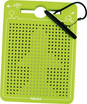 Dieses Magnetspiel verbindet zwei kreative Spiele im praktischen, zweiseitigen Design. Auf der einen Seite können Kinder magnetische Kugeln sichtbar machen, um spannende Bilder aus Formen und Mustern zu gestalten. Auf der anderen Seite ist ein farbenfrohes Sortierspiel integriert. Bunte Kugeln müssen in die jeweils passenden farbigen Töpfe sortiert werden.