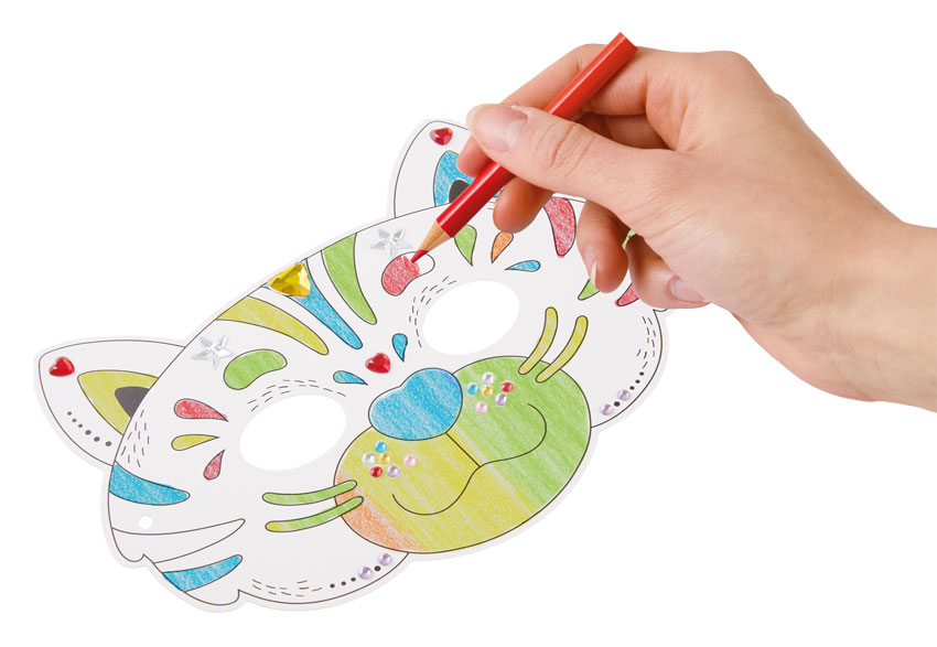 Inhalt: 6 hochwertige Papiermasken mit unterschiedlichen Tiermotiven zum Bemalen, Gummiband, 85 bunte Diamantsticker & 5 Buntstifte