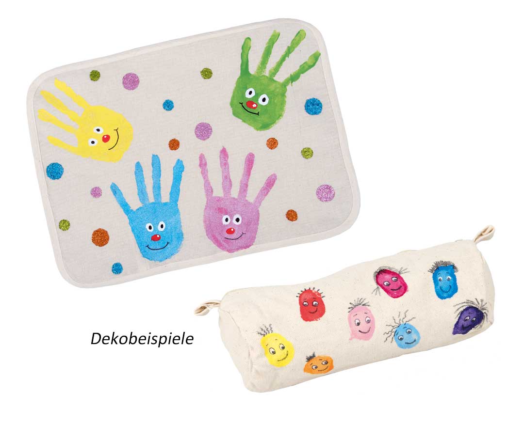 Pastose Textilfingermalfarbe auf Wasserbasis zum Malen mit Fingern, Händen oder Pinsel. Für die Gestaltung von hellen und dunklen Textilien aus Baumwolle oder Mischgewebe mit bis zu 20 % Kunstfaseranteil. Textilien sollten appreturfrei sein. Fixierung durch intensives, linksseitiges Bügeln (5 Min. bei Baumwolleinstellung), im vorgeheizten Backofen (150°C, 8 Min) oder durch Trocknen an der Luft (mindestens 24 Std.).