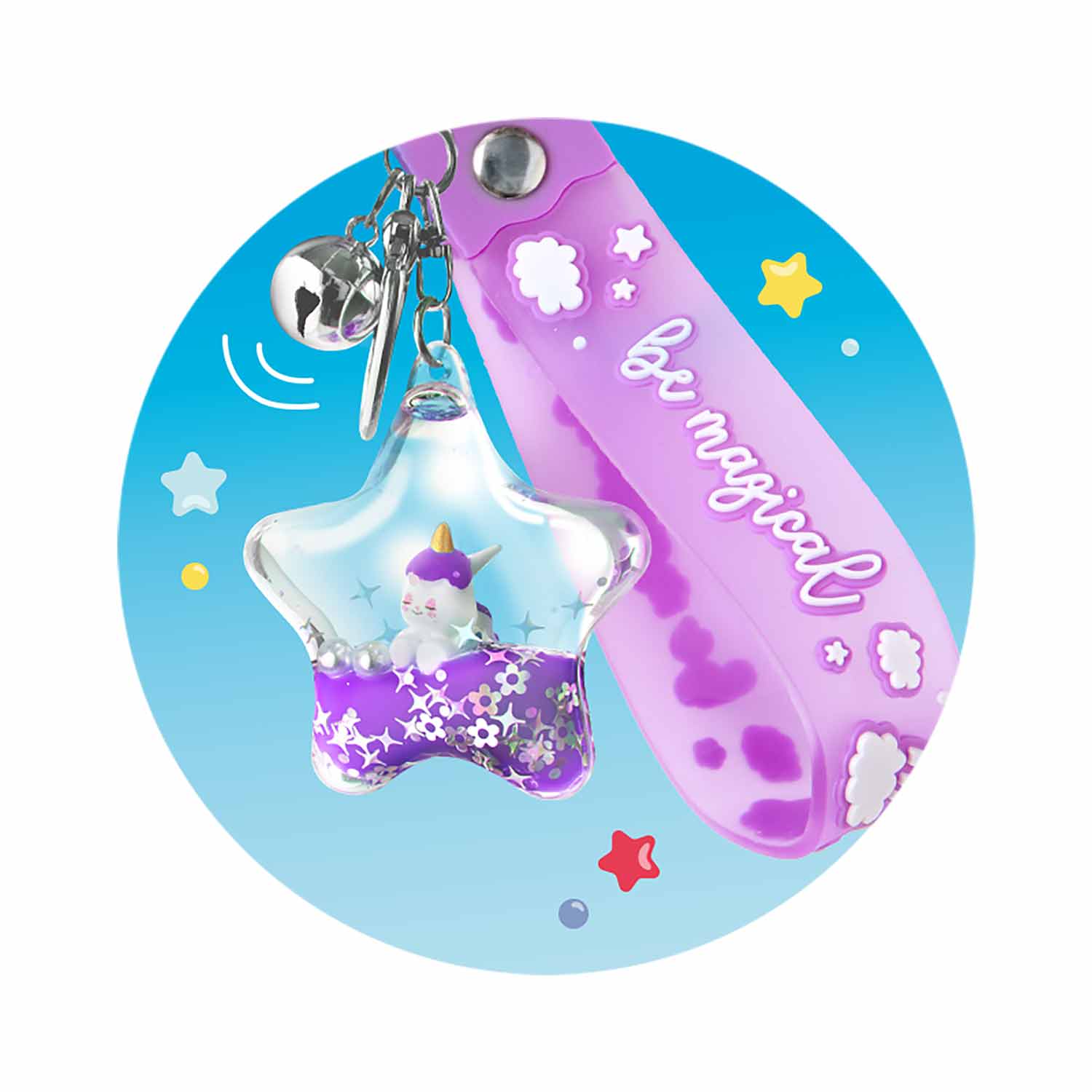 Dieser Silikon-Schlüsselanhänger mit dem coolen Schriftzug ist garantiert ein Hingucker! In dem transparenten Stern schwimmen ein Einhorn, sowie silbernes Konfetti und kleine Perlen in farbigem Wasser.