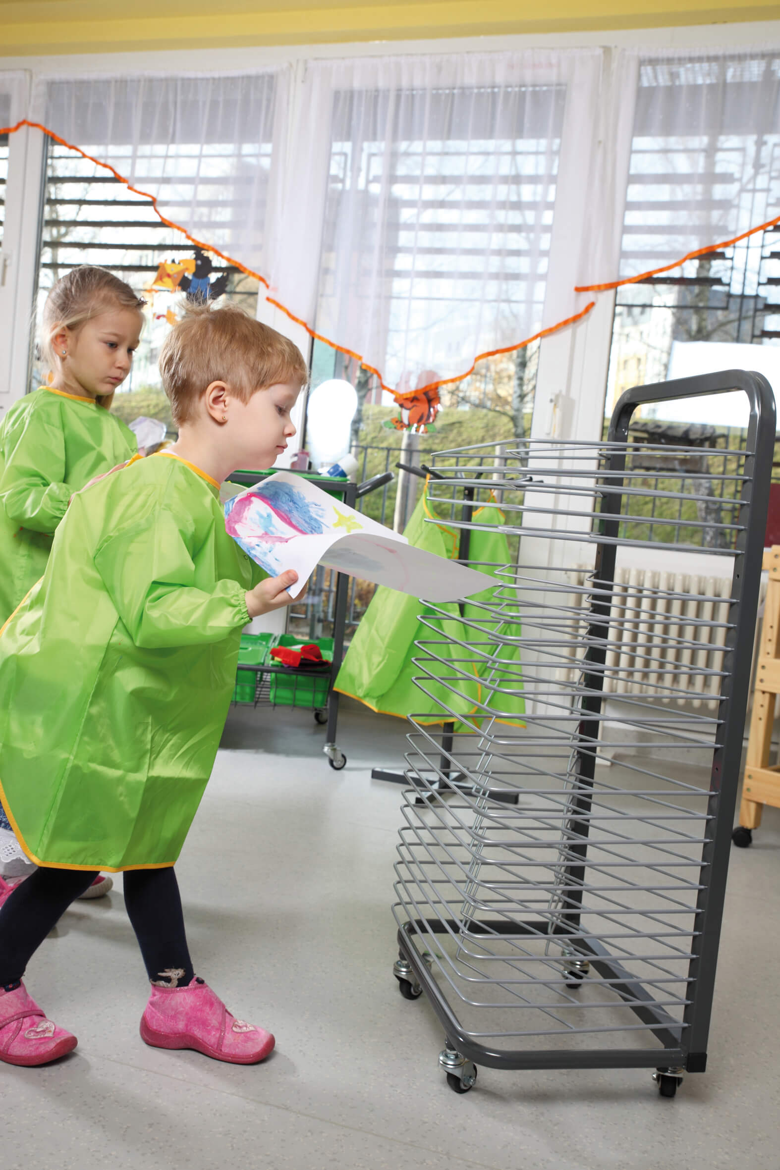 Der Trockenwagen hält mit seinen 25 Lagen Platz für 25 Blätter im DIN A3- oder 50 Blätter im DIN A4-Format bereit. Mit den vier praktischen Rädern kann er im Raum flexibel verschoben werden und mit den 2 feststellbaren Rädern sorgt er für einen festen Stand.